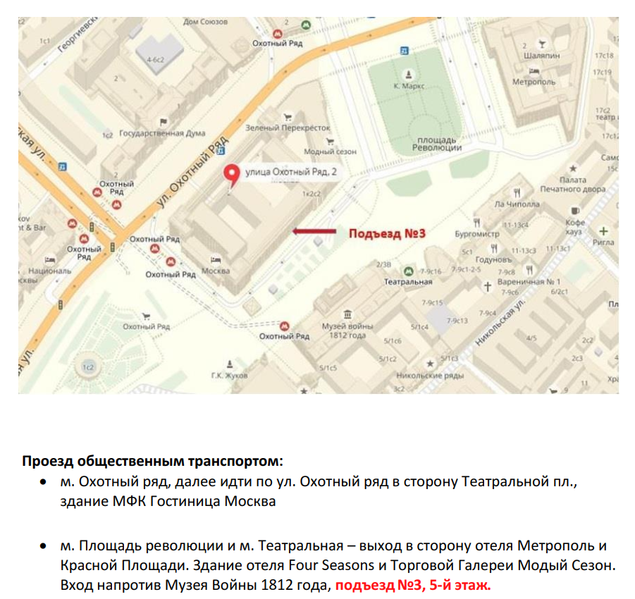ОЧНОЕ УЧАСТИЕ (в зале): Начало регистрации - в 10.00 по московскому времени, регистрация очного участия будет проводиться непосредственно в день проведения конференции (на стойке перед входом в зал). Конференция состоится по адресу: г. Москва, ул. Охотный Ряд, д. 2, подъезд 3, этаж 5, Meeting Point (вход напротив Музея Войны 1812 года, схема проезда), вход в здание при предъявлении документа, удостоверяющего личность.